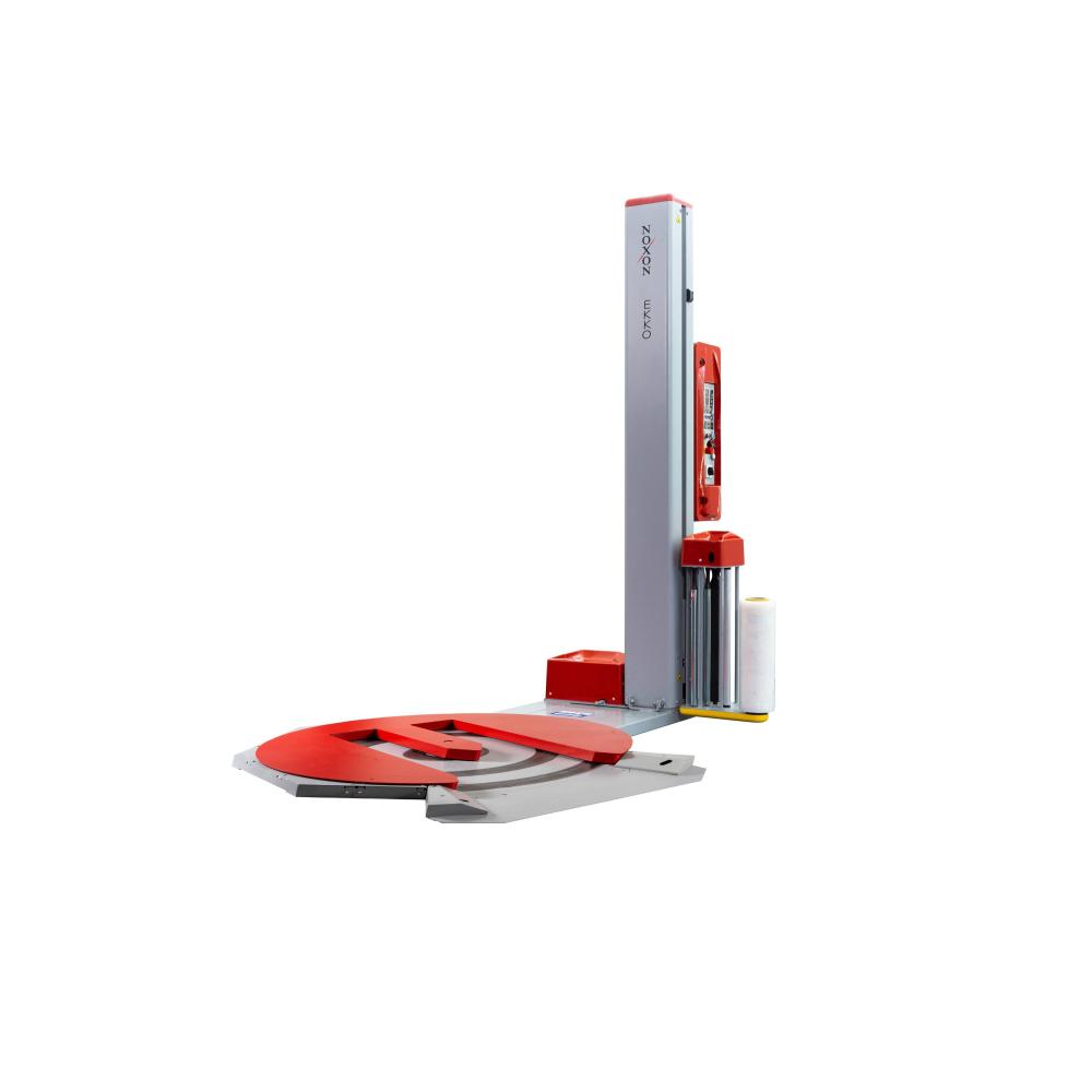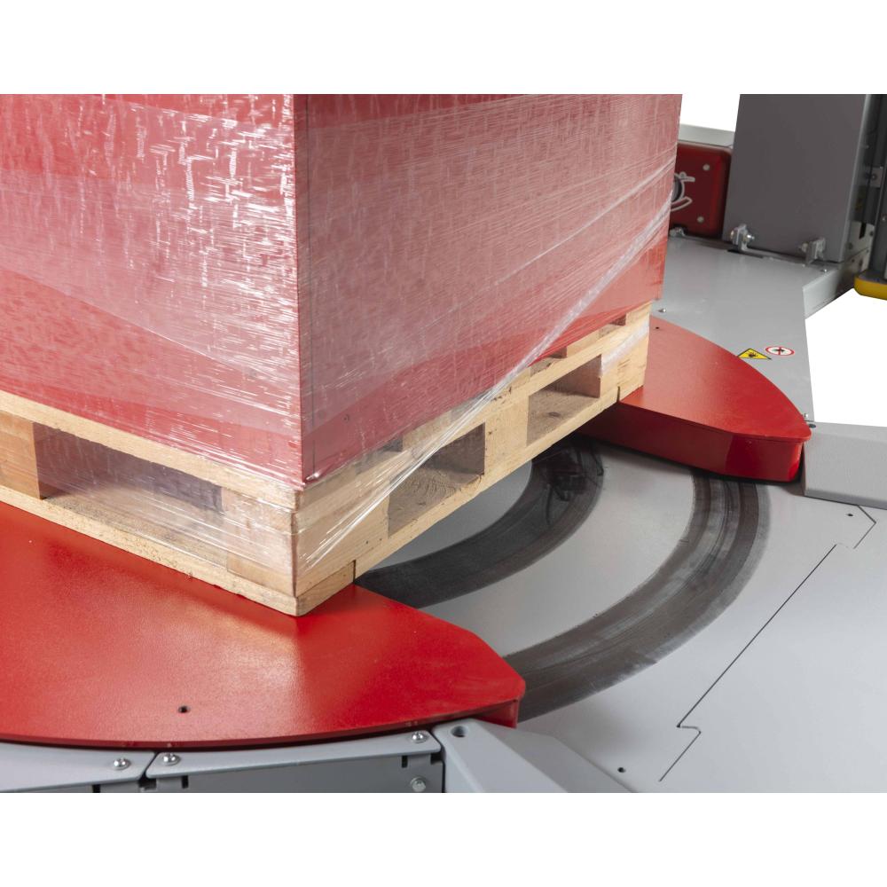 Semi-automatic turntable for wrapping pallets with stretch film, comn transpallet base for manual loading without the need for forklifts.