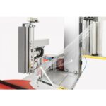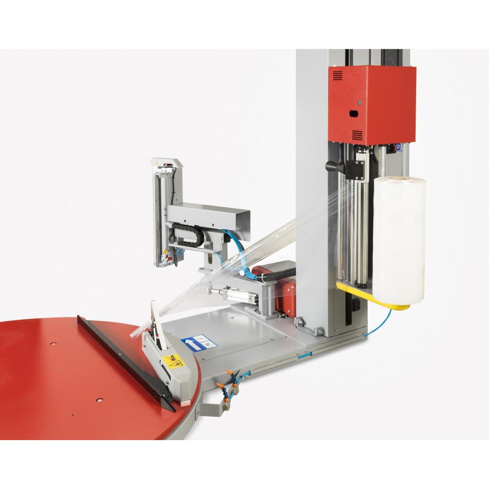 Automatic turntable stretch wrapping machines with clamp, cutting and spreading unit.